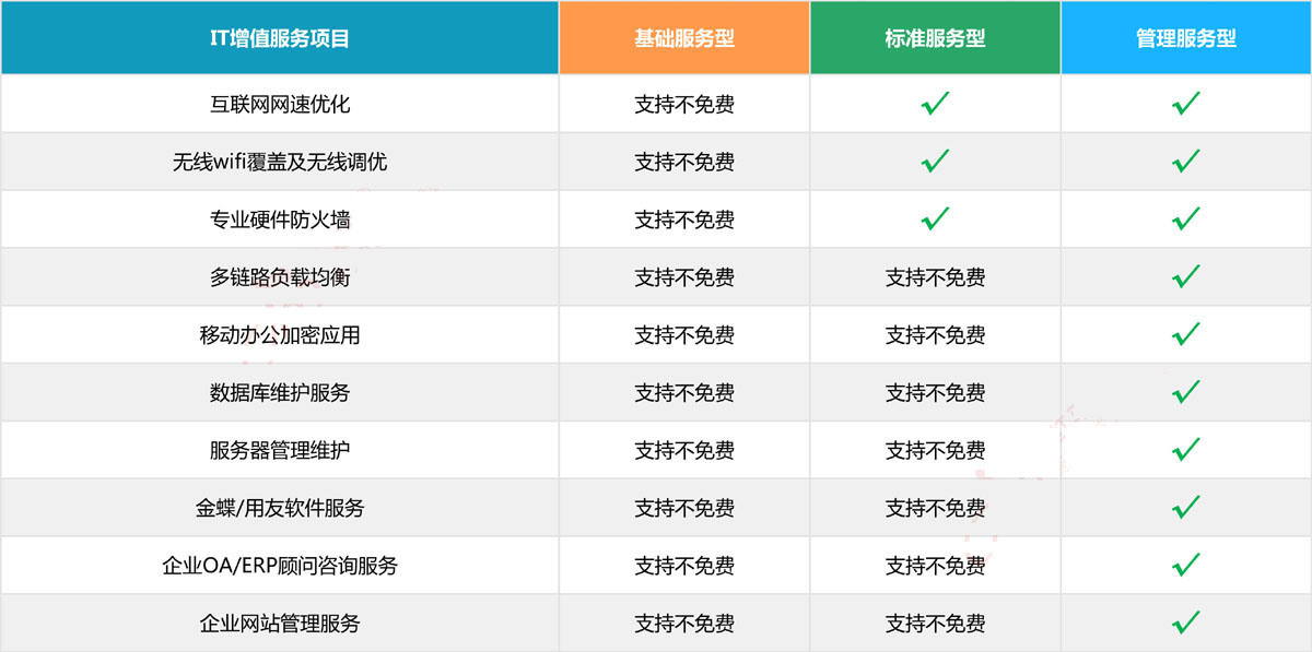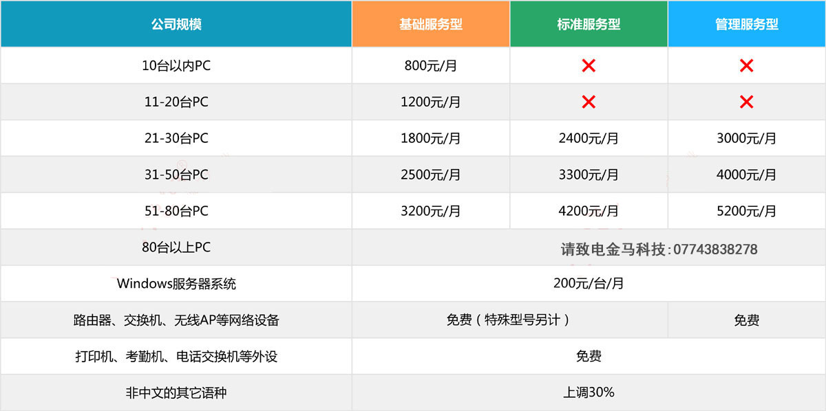 以下為金馬科技標(biāo)準(zhǔn)IT外包服務(wù)套餐,更多個(gè)性化服務(wù)費(fèi)用預(yù)算,請(qǐng)來電咨詢。